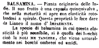 La specie di balsamina in cui questa elasticità è più sensibile, si è quella dei boschi; cioè la noli me tangere, che viene naturalmente nei boschi ombrosi ed umidi. [immagine] |