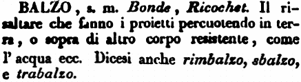 | Rimbalzo, Balzo, Sbalzo, Sobbalzo, Strabalzo - Balzo è il risaltare che fa una cosa per forza di elasticità battendo sopra un'altra; ma il Balzo può esser dato anche da cosa che non abbia battuto sopra un'altra. Chi dà un Balzo per afferrare un oggetto o una persona non dà un rimbalzo. Rimbalzo par più proprio di cosa che balzi per elasticità propria o di altro corpo battendo su di esso. Il balzo par più alto e più vivo; il Rimbalzo anche basso e fiacco. Due corpi in moto veloce che si urtino fanno un rimbalzo non un balzo. Batto in terra una palla di gomma e la riprendo subito in mano dopo il balzo: questo non mi pare un rimbalzo. Poi Rimbalzo sembra più proprio dei balzi successivi. Ciò apparisce anche dai modi proverbiali presi dal giuoco della palla nella quale il Prenderla di balzo è il contrario del Prenderla di posta, ossia Prenderla dopo che ha battuto in terra e non prima che vi cada. Coglier la palla al balzo è stata sempre stimata destrezza come Prendere l'occasione al balzo e Aspettare o Cogliere uno al balzo. Di rimbalzo ne' modi figurati ha sempre senso di cosa fatta o udita quasi per caso. - Sbalzo è per lo più balzo di cosa che vada balzando non tanto alto e lungo un piano, sempre procedendo innanzi a ogni balzo. Balzo, quasi sempre dal basso in alto; Rimbalzo dal basso in alto e anche orizzontalmente. - Sobbalzo è balzo sempre dal basso in alto; Strabalzo è balzo in alto ma inclinando a destra o a sinistra. Un carro fa un sobbalzo passando veloce attraverso le rotaje della strada ferrata: un grosso sasso sotto la ruota destra gli fa dare uno strabalzo a sinistra, e forse chi v'è sopra dà un balzo per salvarsi. G. F. [immagine] |