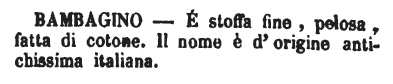| Bambagino - E' stoffa fine, pelosa, fatta di cotone. Il nome è d'origine antichissima italiana. [immagine] |