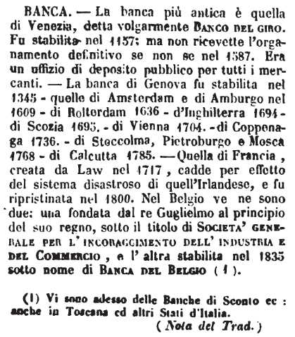 | Banca - La banca più antica è quella di Venezia, detta volgarmente Banco del giro. Fu stabilita nel 1157; ma non ricevette l'organamento definitivo se non se nel 1587. Era un uffizio di deposito pubblico per tutti i mercanti. - La banca di Genova fu stabilita nel 1345 - quelle di Amsterdam e di Amburgo nel 1609 - di Rotterdam 1636 - d'Inghilterra 1694 - di Scozia 1695. - di Vienna 1704. - di Coppenaga 1736. - di Stoccolma, Pietroburgo e Mosca 1768 - di Calcutta 1785. - Quella di Francia, creata da Law nel 1717, cadde per effetto del sistema disastroso di quell'Irlandese, e fu ripristinata nel 1800. Nel Belgio ve ne sono due: una fondata dal re Guglielmo al principio del suo regno, sotto il titolo di Società generale per l'incoraggimento dell'industria e del Commercio, e l'altra stabilita nel 1835 sotto nome di Banca del Belgio (1).