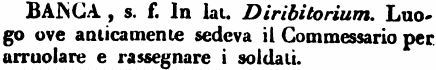 | Banca - s. f. In lat. Diribitorium. Luogo ove anticamente sedeva il Commessario per arruolare e rassegnare i soldati. [immagine] |