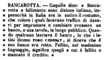 | Bancarotta - Coquille dice: «Bancarotta e fallimento sono dizione italiana, imperocchè in Italia era in antico il costume, che coloro i quali facevano traffico di danari per imprestare o cambiare avessero un banco, o una tavola, in luogo pubblico. Quando qualcuno lasciava il banco, lo che i latini dicono foro cedebat, si diceva che il suo banco era rotto. Fallito, nel medesimo linguaggio, significa quegli a cui è fallito o mancato il credito. » [immagine] |