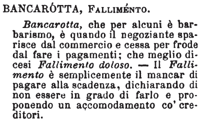 | Bancarotta, Fallimento - Bancarotta, che per alcuni è barbarismo, è quando il negoziante sparisce dal commercio e cessa per frode dal fare i pagamenti; che meglio dicesi Fallimento doloso. - Il Fallimento è semplicemente il mancar di pagare alla scadenza, dichiarando di non essere in grado di farlo e proponendo un accomodamento co' creditori. [immagine] |