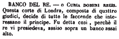 | Banco del re - o Curia Domini Regis. Questa corte di Londra, composta di quattro giudici, decide di tutte le faccende che interessano il principe. Fu detta così, perchè il re vi presiedeva, assiso sopra un banco assai alto. [immagine] |