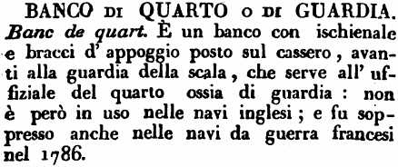 | Banco di quarto o di guardia - Banc de quart. È un banco con ischienale e bracci d'appoggio posto sul cassero, avanti alla guardia della scala, che serve all'uffiziale del quarto ossia di guardia: non è però in uso nelle navi inglesi; e fu soppresso anche nelle navi da guerra francesi nel 1786. [immagine] |