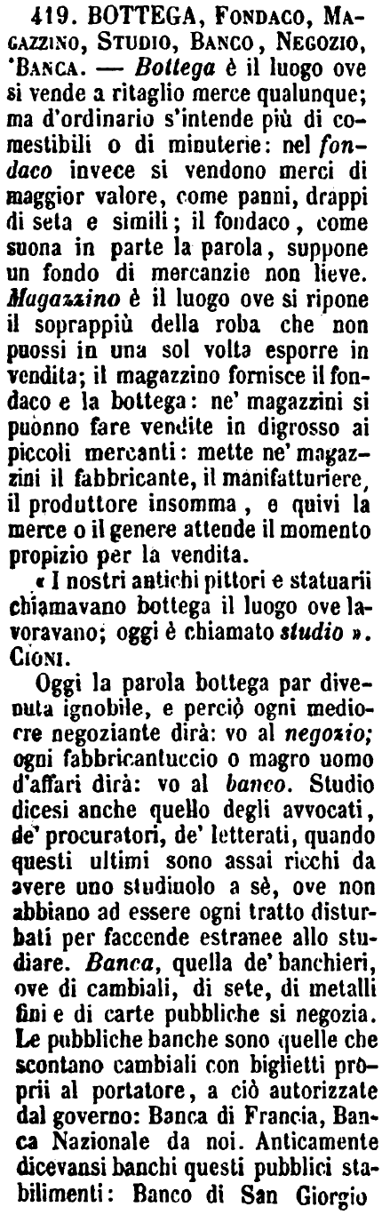 Bottega, Fondaco, Magazzino, Studio, Banco, Negozio, Banca - Bottega è il luogo ove si vende a ritaglio merce qualunque; ma d'ordinario s'intende più di comestibili o di minuterie: nel fondaco invece si vendono merci di maggior valore, come panni, drappi di seta e simili; il fondaco, come suona in parte la parola, suppone un fondo di mercanzie non lieve. Magazzino è il luogo ove si ripone il soprappiù della roba che non puossi in una sol volta esporre in vendita; il magazzino fornisce il fondaco e la bottega: ne' magazzini si puonno fare vendite in digrosso ai piccoli mercanti: mette ne' magazzini il fabbricante, il manifatturiere, il produttore insomma, e quivi la merce o il genere attende il momento propizio per la vendita.