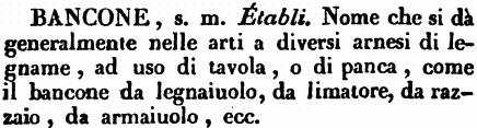 | Bancone - s. m. Établi. Nome che si dà generalmente nelle arti a diversi arnesi di legname, ad uso di tavola, o di panca, come il bancone da legnaiuolo, da limatore, da razzaio, da armaiuolo, ecc. [immagine] |