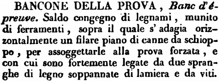 | Bancone della prova - Banc d'épreuve. Saldo congegno di legnami, munito di ferramenti, sopra il quale s'adagia orizzontalmente un filare piano di canne da schioppo, per assoggettarle alla prova forzata, e con cui sono fortemente legate da due spranghe di legno soppannate di lamiera e da viti. [immagine] |
