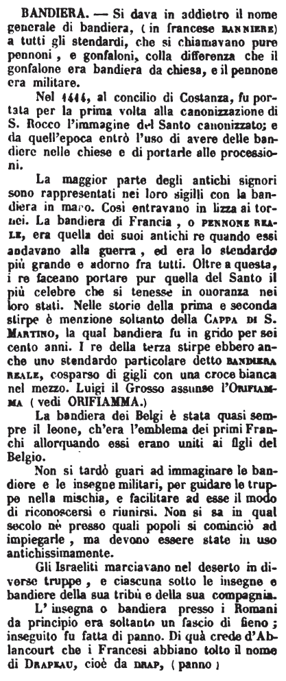 | Bandiera - Si dava in addietro il nome generale di bandiera, (in francese banniere) a tutti gli stendardi, che si chiamavano pure pennoni, e gonfaloni, colla differenza che il gonfalone era bandiera da chiesa, e il pennone era militare.