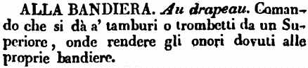 | Alla bandiera - Au drapeau. Comando che si dà a' tamburi o trombetti da un Superiore, onde rendere gli onori dovuti alle proprie bandiere. [immagine] |