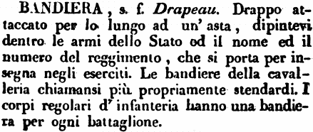 | Bandiera - s. f. Drapeau. Drappo attaccato per lo lungo ad un'asta, dipintevi dentro le armi dello Stato ed il nome ed il numero del reggimento, che si porta per insegna negli eserciti. Le bandiere della cavalleria chiamansi più propriamente stendardi. I corpi regolari d'infanteria hanno una bandiera per ogni battaglione. [immagine] |