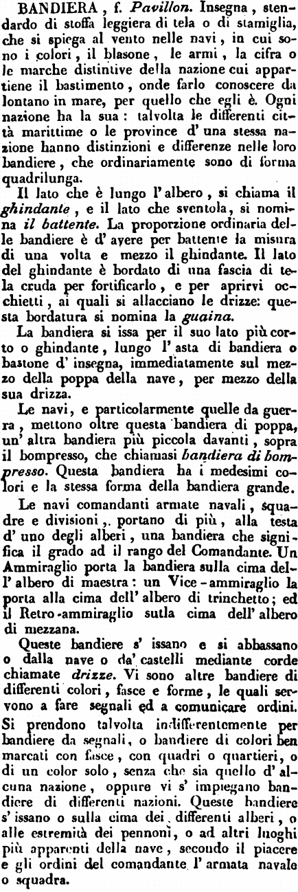 | Bandiera - f. Pavillon. Insegna, stendardo di stoffa leggiera di tela o di stamiglia, che si spiega al vento nelle navi, in cui sono i colori, il blasone, le armi, la cifra o le marche distintive della nazione cui appartiene il bastimento, onde farlo conoscere da lontano in mare, per quello che egli è. Ogni nazione ha la sua: talvolta le differenti città marittime o le province d'una stessa nazione hanno distinzioni e differenze nelle loro bandiere, che ordinariamente sono di forma quadrilunga.