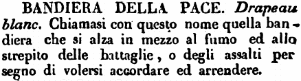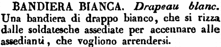 | Bandiera bianca - Drapeau blanc. Una bandiera di drappo bianco, che si rizza dalle soldatesche assediate per accennare alle assedianti, che vogliono arrendersi. [immagine] |