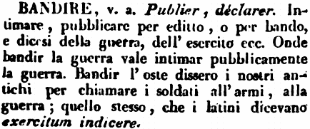 | Bandire - v. a. Publier, déclarer. Intimare, pubblicare per editto, o per bando, e dicesi della guerra, dell'esercito ecc. Onde bandir la guerra vale intimar pubblicamente la guerra. Bandir l'oste dissero i nostri antichi per chiamare i soldati all'armi, alla guerra; quello stesso, che i latini dicevano exercitum indicere. [immagine] |
