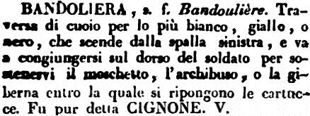 | Bandoliera - Una Cintura o tracolla di cuojo gettata sull'omero destro, e pendente poi sotto il braccio sinistro, la quale usavasi dagli antichi Moschettieri per sostenere le loro armi e le loro cariche o munizioni per il moschetto. (V. anche Balteum). |