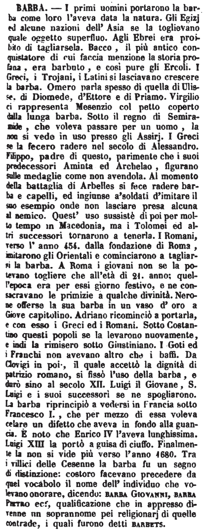| Barba - Gli uomini di tutte le Nazioni si lasciarono per lungo tempo crescer la barba, e la conservarono con una cura tale che se ne riguardava la perdita come cosa ignominiosa ed anche come un oltraggio. Sembra che si cominciasse a raderla in Persia. Almeno è certo, che essendone stata fatta da Alessandro la conquista, fra tutti gli usi, che parve adottare, non obliò questo; e fu il primo dei Greci, che si facesse rader la barba. L'esempio d'Alessandro estese ben presto questo costume in tutta la Grecia, d'onde passò a Roma; ma ciò non accadde che nell'anno 404. dalla fondazione della Città, allorchè vi si recarono barbieri di Sicilia.