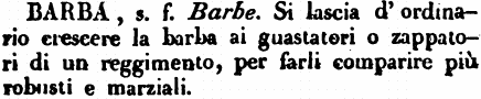 | Barba - s.f. Barbe. Si lascia d'ordinario crescere la barba ai guastatori o zappatori di un reggimento, per farli comparire più robusti e marziali. [immagine] |