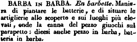 | Barba in barba - En barbette. Maniera di piantare le batterie, e di situare le artiglierie allo scoperto e sui luoghi più elevati, onde la canna del pezzo giuochi sul parapetto: dicesi anche pezzo in barba, batteria in barba. [immagine] |