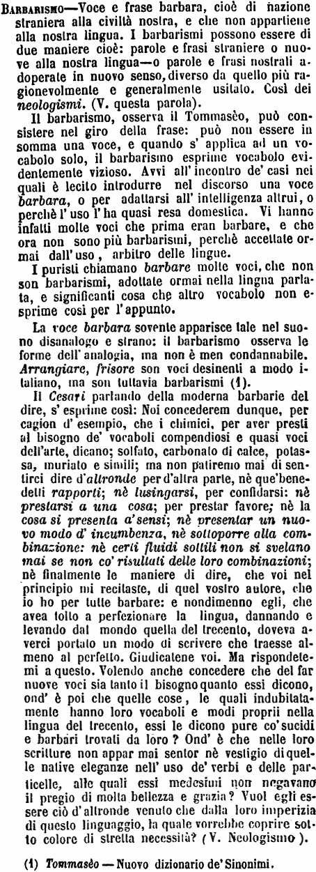 La voce barbara sovente apparisce tale nel suono disanalogo e strano: il barbarismo osserva le forme dell'analogia, ma non è men condannabile. Arrangiare, frisore son voci desinenti a modo italiano, ma son tuttavia barbarismi (1).
