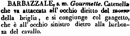 | Barbazzale - s. m. Gourmette. Catenella che va attaccata all'occhio diritto del morso della briglia, e si congiunge col gangetto, che è all'occhio sinistro dietro alla barbozza del cavallo. [immagine] |