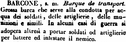 | Barcone - s. m. Barque de transport. Grossa barca che serve alla condotta per acqua dei soldati, delle artiglierie, delle munizioni e simili. In alcuni casi di guerra si adopera altresì a portar soldati od artiglierie per battere ed infestare il nemico. [immagine] |