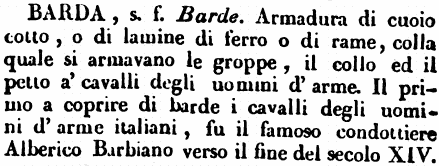 | Barda - s. f. Barde. Armadura di cuoio cotto, o di lamine di ferro o di rame, colla quale si armavano le groppe, il collo ed il petto a' cavalli degli uomini d'arme. Il primo a coprire di barde i cavalli degli uomini d'arme italiani, fu il famoso condottiere Alberico Barbiano verso il fine del secolo XIV. [immagine] |