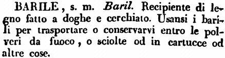 | Barile - s. m. Baril. Recipiente di legno fatto a doghe e cerchiato. Usansi i barili per trasportare o conservarvi entro le polveri da fuoco, o sciolte od in cartucce od altre cose. [immagine] |
