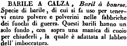 | Barile a calza - Baril à bourse. Specie di barile, di cui si fa uso per tenervi entro polvere e polverini nelle fabbriche dei fuochi di guerra. Questi barili hanno un solo fondo, con sopra una manica di cuoio per chiuderli, la quale è adattata al labbro dell'imboccatura. [immagine] |