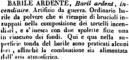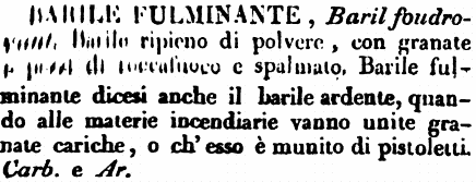 | Barile fulminante - Baril foudroyant. Barile ripieno di polvere, con granate e pezzi di roccafuoco e spalmato. Barile fulminante dicesi anche il barile ardente, quando alle materie incendiarie vanno unite granate cariche, o ch'esso è munito di pistoletti. Carb. e Ar. [immagine] |