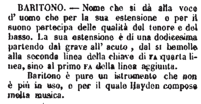 | Baritono - Nome che si dà alla voce d'uomo che per la sua estensione e per il suono partecipa delle qualità del tenore e del basso. La sua estensione è di una dodicesima partendo dal grave all'acuto, dal si bemolle alla seconda linea della chiave di fa quarta linea, sino al primo fa della linea aggiunta.