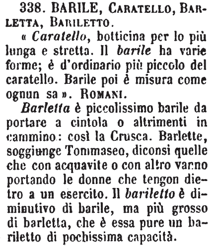 Barile, Caratello, Barletta, Bariletto - «Caratello, botticina per lo più lunga e stretta. Il barile ha varie forme; è d'ordinario più piccolo del caratello. Barile poi è misura come ognun sa». Romani.