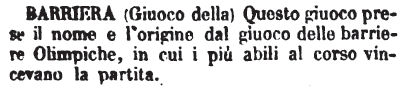 | Barriera (giuoco della) - Questo giuoco prese il nome e l'origine dal giuoco delle barriere Olimpiche, in cui i più abili al corso vincevano la partita. [immagine] |