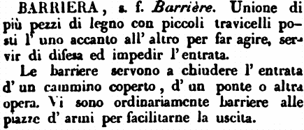 | Barriera - s. f. Barrière. Unione di più pezzi di legno con piccoli travicelli posti l'uno accanto all'altro per far agire, servir di difesa ed impedir l'entrata.