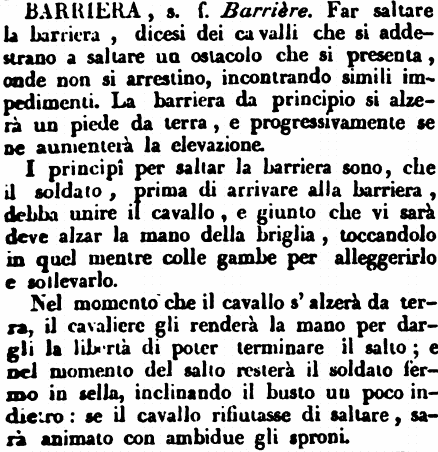 | Barriera - s. f. Barrière. Far saltare la barriera, dicesi dei cavalli che si addestrano a saltare un ostacolo che si presenta, onde non si arrestino, incontrando simili impedimenti. La barriera da principio si alzerà un piede da terra, e progressivamente se ne aumenterà l'elevazione.