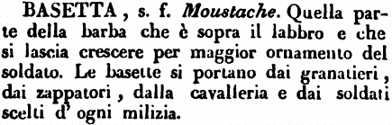 | Basetta - s. f. Moustache. Quella parte della barba che è sopra il labbro e che si lascia crescere per maggior ornamento del soldato. Le basette si portano dai granatieri, dai zappatori, dalla cavalleria e dai soldati scelti d'ogni milizia. [immagine] |