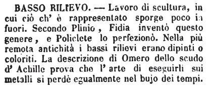 | Basso rilievo - Lavoro di scultura, in cui ciò ch'è rappresentato sporge poco in fuori. Secondo Plinio, Fidia inventò questo genere, e Policlete lo perfezionò. Nella più remota antichità i bassi rilievi erano dipinti o coloriti. La descrizione di Omero dello scudo d'Achille prova che l'arte di eseguirli sui metalli si perdè egualmente nel bujo dei tempi. [immagine] |