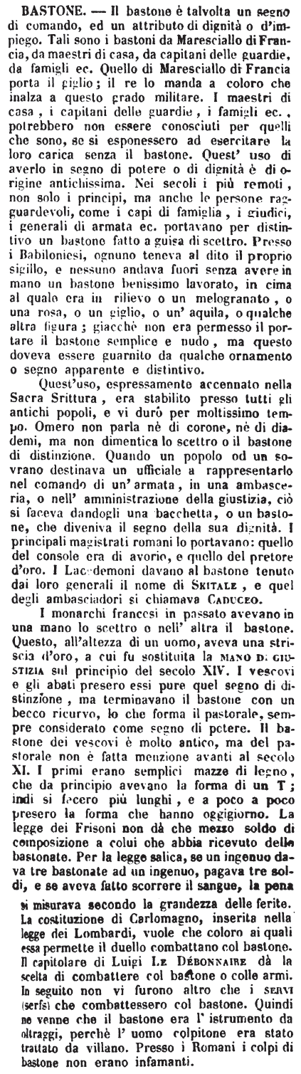 | Bastone - Il bastone è talvolta un segno di comando, ed un attributo di dignità o d'impiego. Tali sono i bastoni da Maresciallo di Francia, da maestri di casa, da capitani delle guardie, da famigli ec. Quello di Maresciallo di Francia porta il giglio; il re lo manda a coloro che inalza a questo grado militare. I maestri di casa, i capitani delle guardie, i famigli ec., potrebbero non essere conosciuti per quelli che sono, se si esponessero ad esercitare la loro carica senza il bastone. Quest'uso di averlo in segno di potere o di dignità è di origine antichissima. Nei secoli i più remoti, non solo i principi, ma anche le persone ragguardevoli, come i capi di famiglia, i giudici, i generali di armata ec. portavano per distintivo un bastone fatto a guisa di scettro. Presso i Babilonesi, ognuno teneva al dito il proprio sigillo, e nessuno andava fuori senza avere in mano un bastone benissimo lavorato, in cima al quale era in rilievo o un melogranato, o una rosa, o un giglio, o un'aquila, o qualche altra figura; giacchè non era permesso il portare il bastone semplice e nudo, ma questo doveva essere guarnito da qualche ornamento o segno apparente e distintivo.