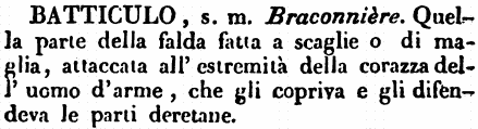 | Batticulo - s. m. Braconnière. Quella parte della falda fatta a scaglie o di maglia, attaccata all'estremità della corazza dell'uomo d'arme, che gli copriva e gli difendeva le parti deretane. [immagine] |