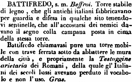 | Battifredo - s. m. Beffroi. Torre stabile di legno, che gli antichi italiani fabbricavano per guardia e difesa in qualche sito tenendovi sentinelle, che all'accostarsi dei nemici davano il segno colla campana posta in cima della stessa torre.