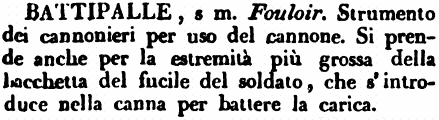 | Battipalle - s m. Fouloir. Strumento dei cannonieri per uso del cannone. Si prende anche per la estremità più grossa della lacchetta del fucile del soldato, che s'introduce nella canna per battere la carica. [immagine] |