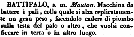 | Battipalo - s. m. Mouton. Macchina da battere i pali, colla quale si alza replicatamente un gran peso, facendolo cadere di piombo sulla testa del palo o altro, che vuolsi conficcare in terra o in altro luogo. [immagine] |