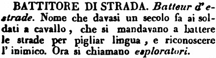 | Battitore di strade - Batteur d'estrade. Nome che davasi un secolo fa ai soldati a cavallo, che si mandavano a battere le strade per pigliar lingua, e riconoscere l'inimico. Ora si chiamano esploratori. [immagine] |