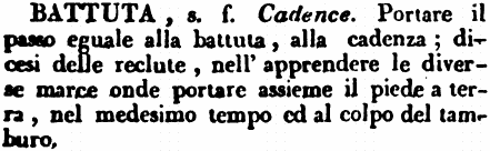 | Battuta - s. f. Cadence. Portare il passo eguale alla battuta, alla cadenza; dicesi delle reclute, nell'apprendere le diverse marce onde portare assieme il piede a terra, nel medesimo tempo ed al colpo del tamburo. [immagine] |