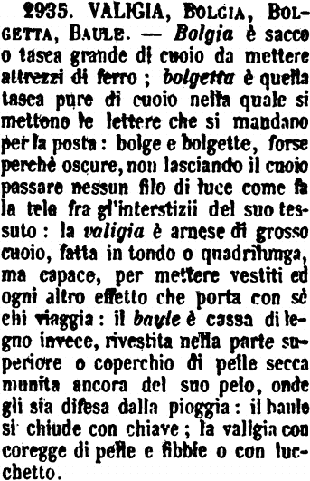 | Valigia, Bolgia, Bolgetta, Baule - Bolgia è sacco o tasca grande di cuoio da mettere attrezzi di ferro; bolgetta è quella tasca pure di cuoio nella quale si mettono le lettere che si mandano per la posta: bolge e bolgette, forse perchè oscure, non lasciando il cuoio passare nessun filo di luce come fa la tela fra gl'interstizii del suo tessuto: la valigia è arnese di grosso cuoio, fatta in tondo o quadrilunga, ma capace, per mettere vestiti ed ogni altro effetto che porta con sè chi viaggia: il baule è cassa di legno invece, rivestita nella parte superiore o coperchio di pelle secca munita ancora del suo pelo, onde gli sia difesa dalla pioggia: il baule si chiude con chiave; la valigia con coregge di pelle e fibbie o con lucchetto. [immagine] |