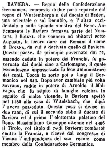 | Baviera - Regno della Confederazione Germanica, composto di due parti separate dal regno di Wurtemberga e dal ducato di Baden, una orientale o sul Danubio, e l'altra occidentale o sulla sponda sinistra del Reno. Anticamente la Baviera formava parte del Noricum. I Boieni, che vennero ad abitarvi sotto Augusto, le fecero dare dai Romani il nome di Bojana, da cui è derivato quello di Baviera. Questo paese, da principio governato dai re, essendo caduto in potere dei Franchi, fu governato dai duchi sino a Carlomagno, il quale essendosene impossessato lo fece amministrare dai conti. Toccò in sorte poi a Luigi il Germanico nel 843. Dopo aver cambiato più volte sovrano, cadde in potere di Arnoldo il Malvagio, che fu stipite di famiglie celebri. In seguito di molte vicende, la Baviera spettò nel 1180 alla casa di Witelsbach, che digià l'aveva posseduta. Questa casa si divise in due rami, di cui il secondo ebbe il ducato di Baviera ed il primo l'elettorato palatino del Reno. Massimiliano Giuseppe ottenne nel 1806 il Tirolo, col titolo di re di Baviera; combattè contro la Francia, e ricevè dal congresso di Vienna l'indipendenza del suo reame come membro della Confederazione Germanica. [immagine] |