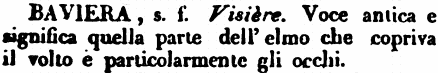 | Baviera - s. f. Visière. Voce antica e significa quella parte dell'elmo che copriva il volto e particolarmente gli occhi. [immagine] |