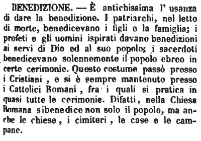 | Benedizione - E' antichissima l'usanza di dare la benedizione. I patriarchi, nel letto di morte, benedicevano i figli e la famiglia; i profeti e gli uomini ispirati davano benedizioni ai servi di Dio ed al suo popolo; i sacerdoti benedicevano solennemente il popolo ebreo in certe cerimonie. Questo costume passò presso i Cristiani, e si è sempre mantenuto presso i Cattolici Romani, fra i quali si pratica in quasi tutte le cerimonie. Difatti, nella Chiesa Romana si benedice non solo il popolo, ma anche le chiese, i cimiteri, le case e le campane. [immagine] |