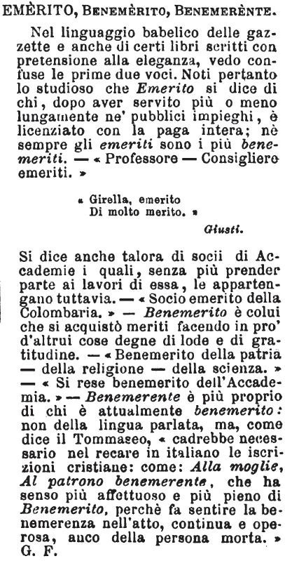 Emerito, Benemerito, Benemerente - Nel linguaggio babelico delle gazzette e anche di certi libri scritti con pretensione alla eleganza, vedo confuse le prime due voci. Noti pertanto lo studioso che Emerito si dice di chi, dopo aver servito più o meno lungamente ne' pubblici impieghi, è licenziato con la paga intera; nè sempre gli emeriti sono i più benemeriti. - «Professore - Consigliere emeriti.»
