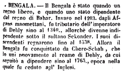 | Bengala - Il Bengala è stato quando un regno libero, e quando uno stato dipendente dal regno di Bahar. Invaso nel 1203. dagli Afgans maomettani, fu tributario dell'imperatore di Dehly sino al 1340., allorchè divenne indipendente sotto il sultano Sekonder. I suoi discendenti regnarono fino al 1538. Allora il Bengala fu conquistato da Chere-Schah, che lo unì nuovamente al reame di Dehly, da cui seguitò a dipendere sino al 1765., epoca nella quale fu ceduto agl'Inglesi. [immagine] |