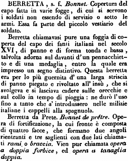 Berretta - s. f. Bonnet. Copertura del capo fatta in varie fogge, di cui si servono i soldati non essendo di servizio o sotto le armi. Essa fa parte del piccolo vestiario del soldato.